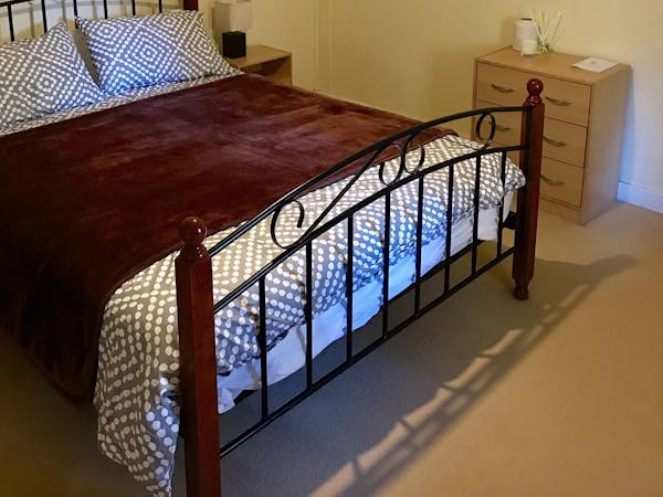 The master bedroom is a spacious room featuring a queen bed, throw rug, electric blanket, bedside tables, lamps, writing desk, electric heater, wardrobe and chest of drawers.